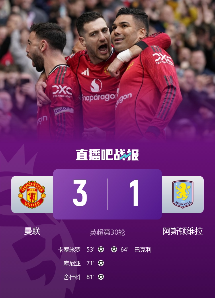 曼联3-1维拉 B费助攻双响破小贝纪录 卡塞米罗库尼亚舍什科破门