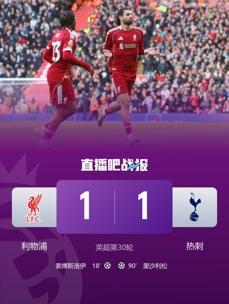 利物浦升至第五,热刺结束各项赛事6连败,领先降级区1分;索博任意球破门,里沙利松绝平。
