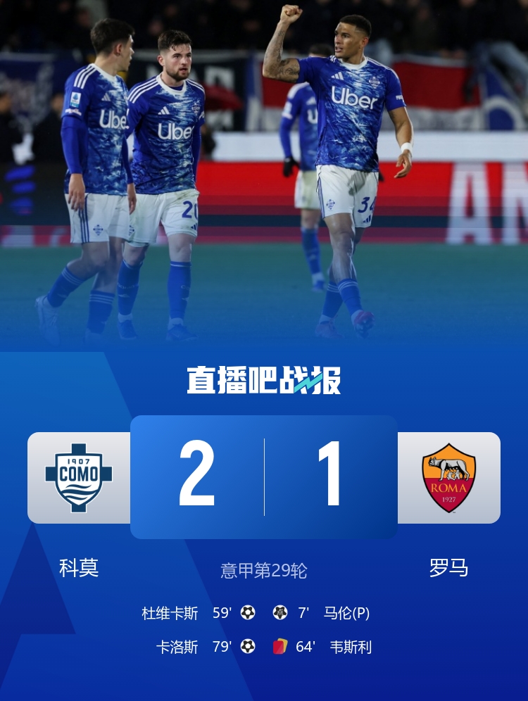 沙拉维造点,马伦点射闪击,杜维卡斯推射扳平,韦斯利两黄一红被罚下,卡洛斯补射反超比分,科莫四连胜升至第4。