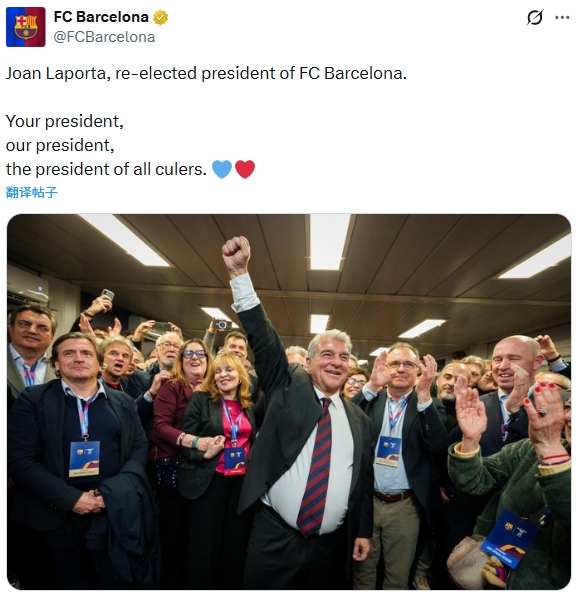 官方消息,拉波尔塔在巴萨主席选举中获胜,击败唯一竞争对手维克托・丰特当选主席,将自7月1日起开启新任期。
